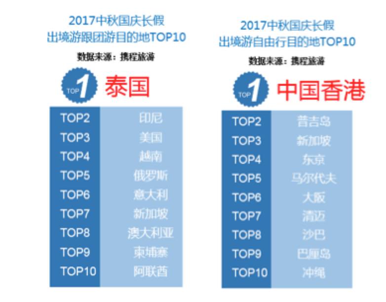 根据携程跟团游、自由行、邮轮等出境业务数据,2017十一黄金周人气排名前二十的出境游国家(地区)依次是:泰国、日本、新加坡、越南、美国、中国香港、马来西亚、中国台湾、印度尼西亚、菲律宾、俄罗斯、澳大利亚、柬埔寨、加拿大、意大利、马尔代夫、德国、英国、阿联酋、斯里兰卡。