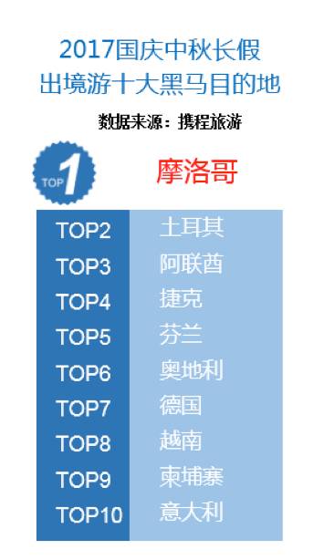摩洛哥、土耳其、阿联酋、捷克、芬兰、奥地利、德国(60%)、越南、柬埔寨、意大利成为2017年十一出境游十大黑马目的地,增速达到50%以上。其中前8个都是长线国家。中欧、北欧、中东、东南亚更多目的地被中国游客选择。
