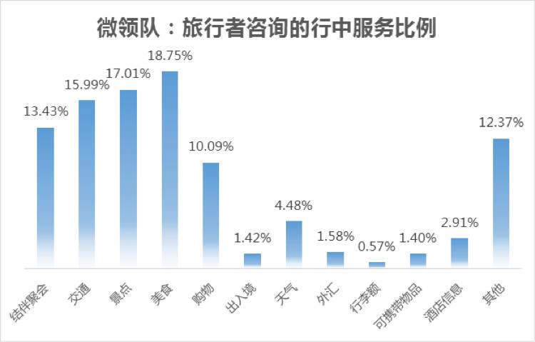 中国出境旅游者特别是自由行游客,最需要哪些服务?根据携程行中服务产品“微领队”大数据统计以及预测,出境游用户咨询求助最为集中的问题是:交通15.9%、景点17.0%、美食18.7%、购物10.0%。其他热点问题还有:天气4.4%、出入境1.4%、外汇1.5%、行李额0.5%、可携带物品1.4%。有意思的是,“结伴”也是旅游者一大的需求,为此携程微领队提供了“旅途结伴”和“全球聚会”等服务。