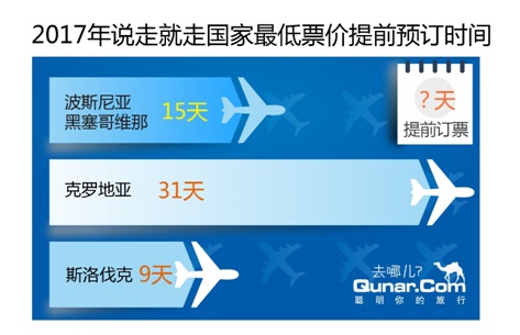 哪些国家可以说走就走?去斯洛伐克最便宜的机票出现在提前9天,而去波黑的特价机票提前两周,去克罗地亚提前一个月订票就能买到便宜的机票。