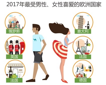 男性、女性在目的地偏好上也有很大的不同。对于男性来说,极具历史感的英国、俄罗斯、法国最受他们的欢迎。对于女性而言,法国、意大利、德国这样交通便利、大牌云集的发达国家最受她们的喜爱。
