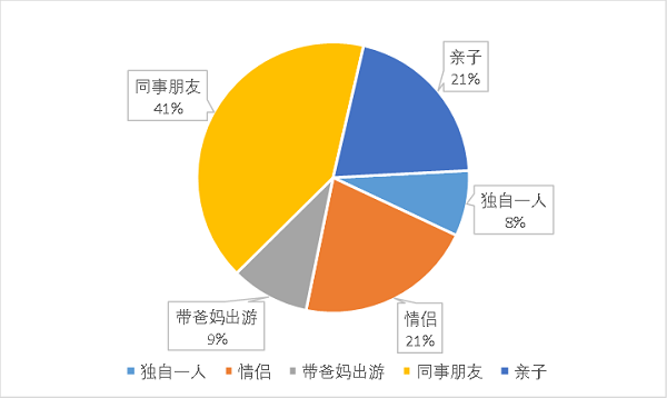 他们更青睐和谁一起跟团出境游?《报告》显示,选择和同事朋友一起出行的游客最多,占41%,情侣出行和亲子出行各占21%,带爸妈跟团出境游占9%,独自一人跟团出境游的比例也有8%。