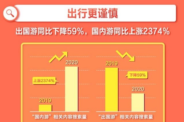 百度搜索大数据显示,近七天“国内游”、“周边游”、“自驾游”相关搜索热度分别同比上涨2374%、30%、18%;而“出国游”、“深度游”、“跟团游”相关内容的搜索热度较去年同期分别下降59%、27%、23%。在出行选择上,越来越多的人更加注重防疫,选择相对谨慎的出行方式。