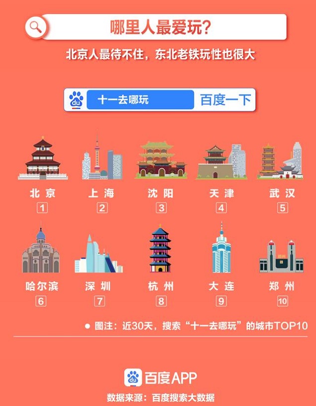 而在最关注“十一去哪玩”相关内容的城市中,北京位列第一,武汉冲进全国前五,沈阳、哈尔滨、大连等东北地区城市也位列前十。