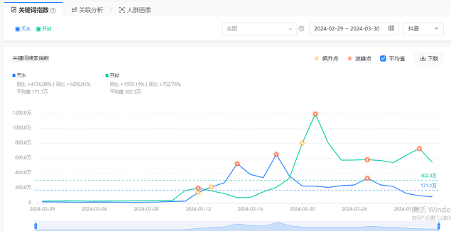 如上图所示,从3月20日开始,开封在抖音上的热度已经超越了天水。而根据百度指数,这个时间点要晚一些,不过也只需要等到3月28日。