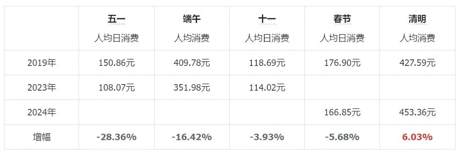根据上述数据不难算出,2024年清明假期,国内游客人均消费较2019年同期增长6.03%。