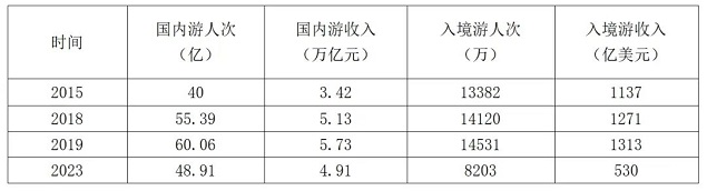 2023年,疫情过后的第一年。当年及之前几年,我国国内游和入境游的数据是这样的: