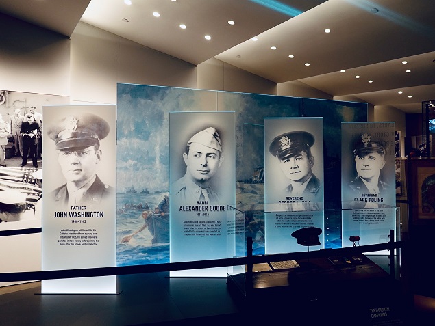 四名随军牧师更是感天动地。1943年2月3日午夜,运输船“多切斯特号”在北大西洋被鱼雷击中,全船顿时陷入黑暗与恐慌,蒸汽和氨气弥漫舱室,船身迅速倾斜。船长下令弃船,4名牧师立即协助士兵逃生(3名曾在哈佛大学陆军牧师学校学习,犹太教拉比古德是博士)。教派不同,行动却高度一致:安抚祈祷、递送物品、发救生衣、帮扶伤员,甚至脱下救生衣递给他人 —— 这可是冰海生存的唯一希望啊!古德将手套也送出:“我还有一副”。幸存者回忆,船沉没的最后一刻,照明弹下他们互挽着手臂祈祷。在生命的最后27分钟,他们把生还的希望让给了别人,用从容与镇定安抚众人。展厅中央,4人的影像活灵灵地呈现在闪亮的玻璃版上,帅气坚毅,催人泪下,他们是A. 古德(Alexander D. Goode)、G.福克斯(George L. Fox)、J.华盛顿(John P. Washington)、C.波林(Clark V. Poling),31岁、42岁、34岁、32岁,其中3人还有家小……